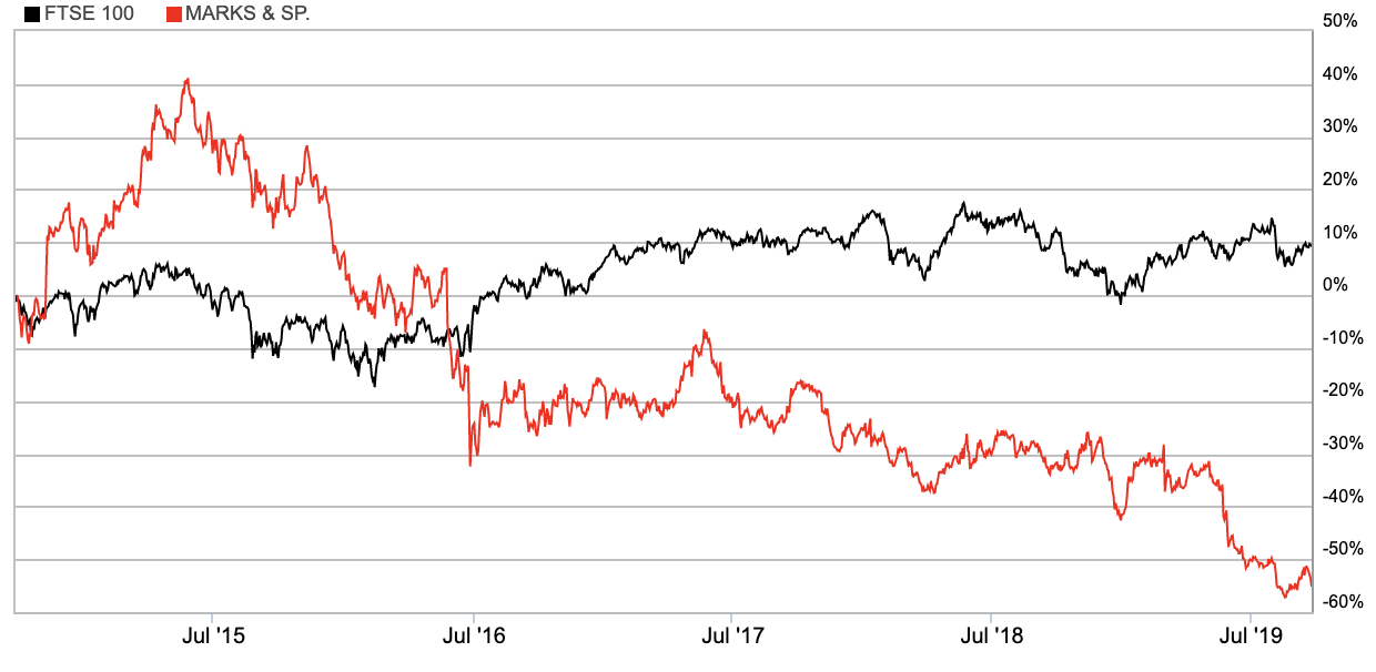 The demotion – M&S is now a member of the FTSE250 – came as no surprise to market followers as the retailer had only just avoided the axe at the June review. As the graph highlights, over the last four years M&S has underperformed the index, with its latest decline prompted by the February 2019 announcement of a dividend cut and a rights issue to raise more capital.