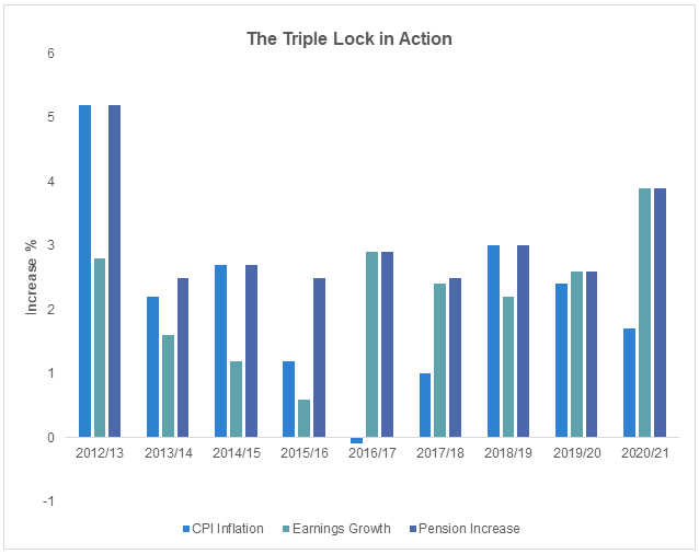 The Triple Lock is a feature that the main political parties pledged to maintain in their 2019 election manifestos, but despite political promises, the Triple Lock has no legal standing. The law governing increases to the BSP and NSP is based on earnings growth. Earnings growth applies to the April 2020 increases (of 3.9%), but in years when it does not take the top slot, the government overrides the statutory rules.