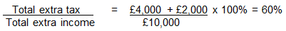 In 2022/23, Yasmin expects to have an income of £100,000 and is therefore entitled to a personal allowance of £12,750. If she receives an unexpected bonus of £10,000, her total income will be £110,000 and her personal allowance will be reduced by half of the amount by which her total income exceeds £100,000 – i.e. £5,000. As a result, she will not only pay tax of £4,000 on her bonus (at 40% outside Scotland), but she will also have to pay £2,000 of tax on the £5,000 of her income no longer covered by the personal allowance. The result is: