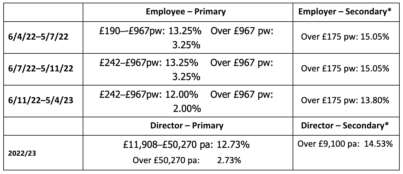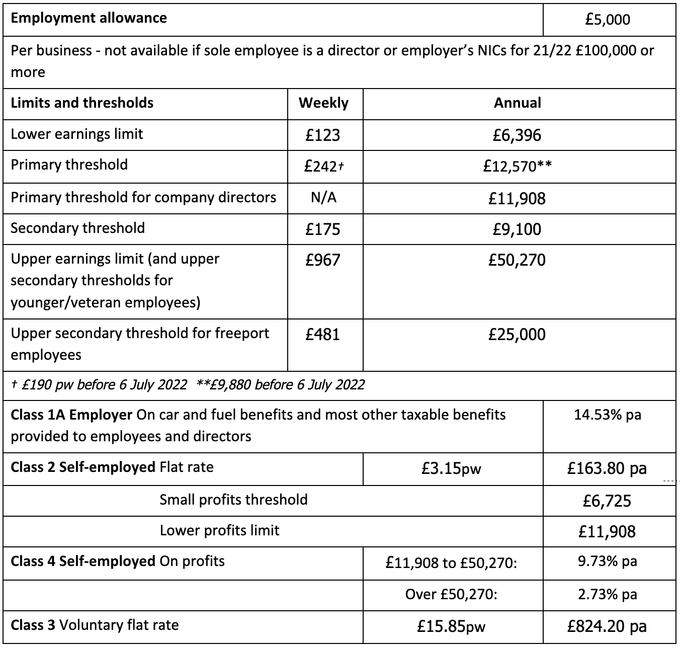 * No employer NICs on the first £967pw for employees generally under 21 years, apprentices under 25 years and veterans in first 12 months of civilian employment. No employer NICs on the first £481pw for employees at freeports in Great Britain in the first three years of employment starting from 6 April 2022